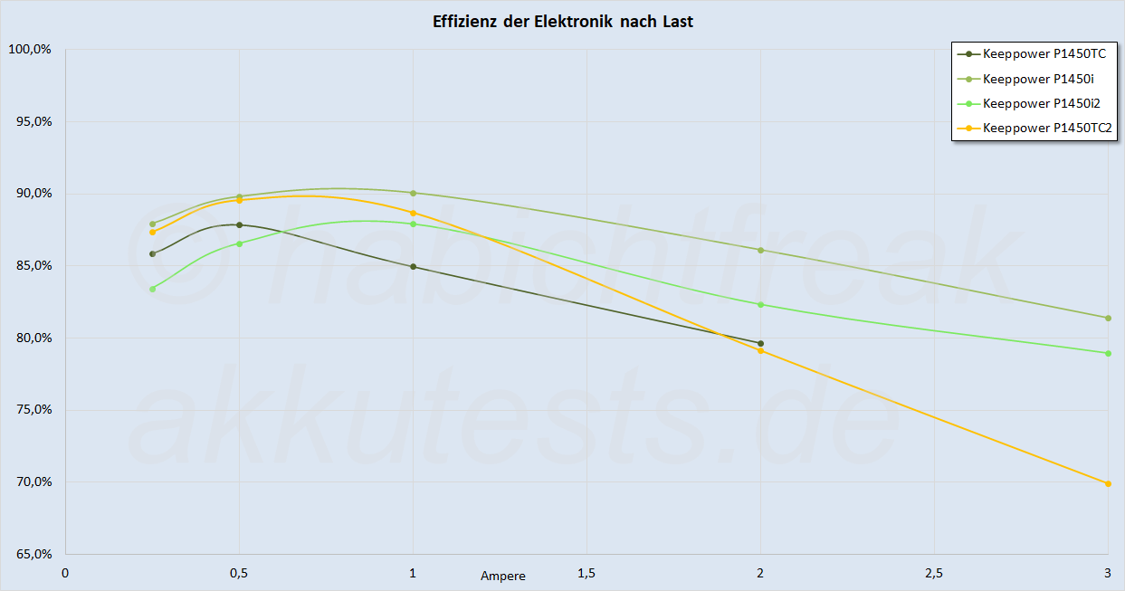 Was sich auch schon im Balkendiagramm erkennen ließ, wird auch hier deutlich. Bei 2 und 3A arbeitet die Elektronik der P1450i2 effizienter als die im P1450TC2. Bei 1A oder geringeren Strömen ist es genau umgekehrt. Neue Maßstäbe setzt hier die Elektronik in den P1450i, die in allen Bereichen am effizientesten arbeitet. Das wirft die Frage auf, warum diese Technik nicht auch im P1450i2 und P1450TC2 steckt. Eine Frage die nur Keeppower beantworten kann.