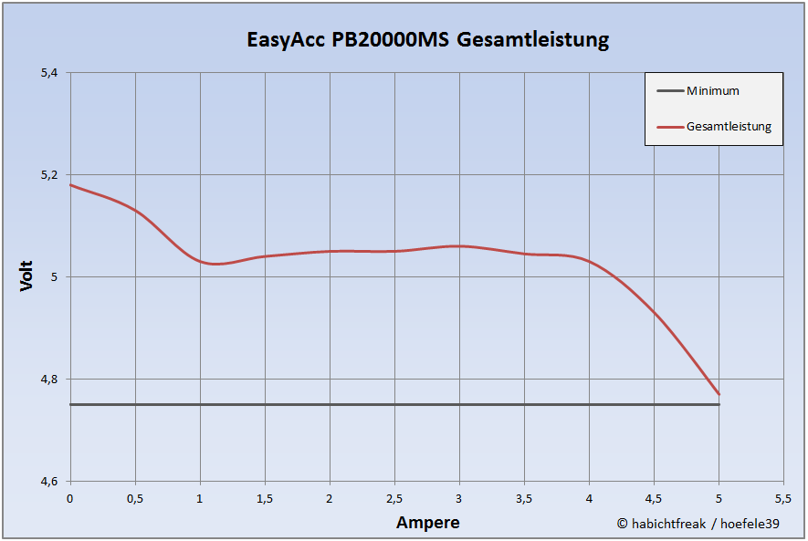Zur Beurteilung der Leistungsfähigkeit ziehen die meisten Tests nur die abgegebene Ladung heran. Diese Werte sind leider in keinster Weise untereinander vergleichbar, denn die Spannung der Powerbank kann zwischen 4,50 V und 5,50 V liegen. Stecken in den Akkus 20 Wh, dann lassen sich daraus ohne Berücksichtigung des Wirkungsgrades bei 4,5 V bis zu 4.4 Ah messen, wohingegen es bei 5,5 V nur 3.6 Ah wären. Aus diesem Grund messe ich nicht nur die Ladung, sondern auch die elektrische Energie. Nur Letzteres wird zur Beurteilung der Leistungsfähigkeit herangezogen.