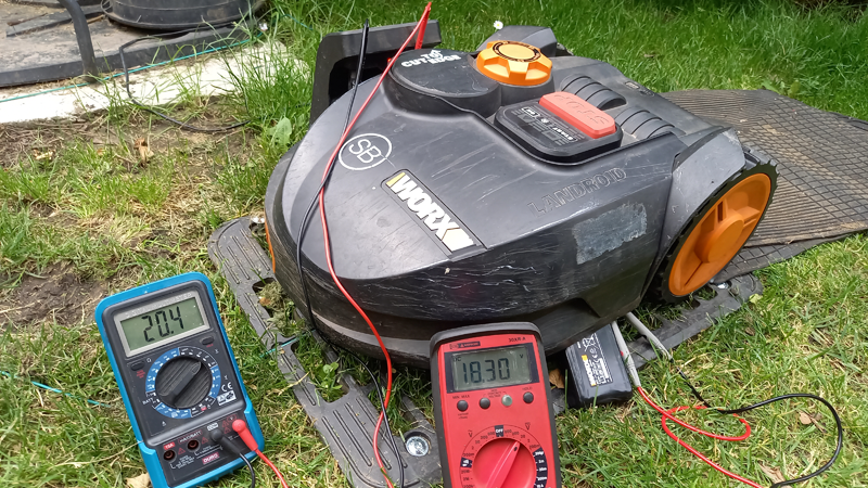 Zu meinem erstaunen funktionierte er ohne Probleme. Vermutlich auch weil in der Zwischenzeit der gesamte Begrenzungsdraht neu verlegt wurde und auch die gesamte Rasenfläche mit Mähkantensteine eingefasst wurde. Nur besonders lange fährt er nicht. Unter 30 Minuten, dann kehrt er in die Station zurück zum Laden. Im Landroid befindet sich noch immer der originale Akku von Worx (WA3230, 20V, 2Ah). Nach über 7 Jahren im täglichen Einsatz darf ein Akku schlapp machen.