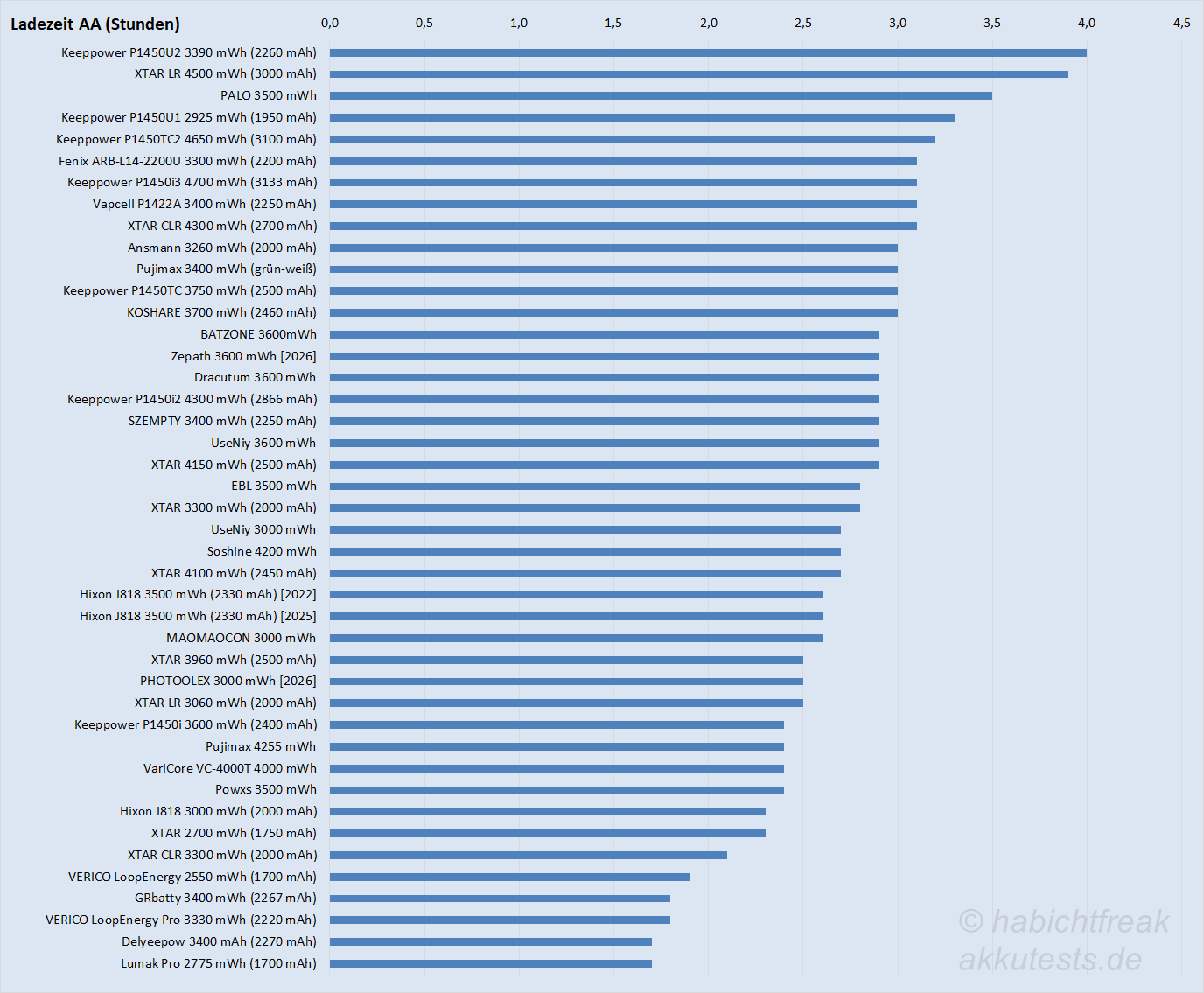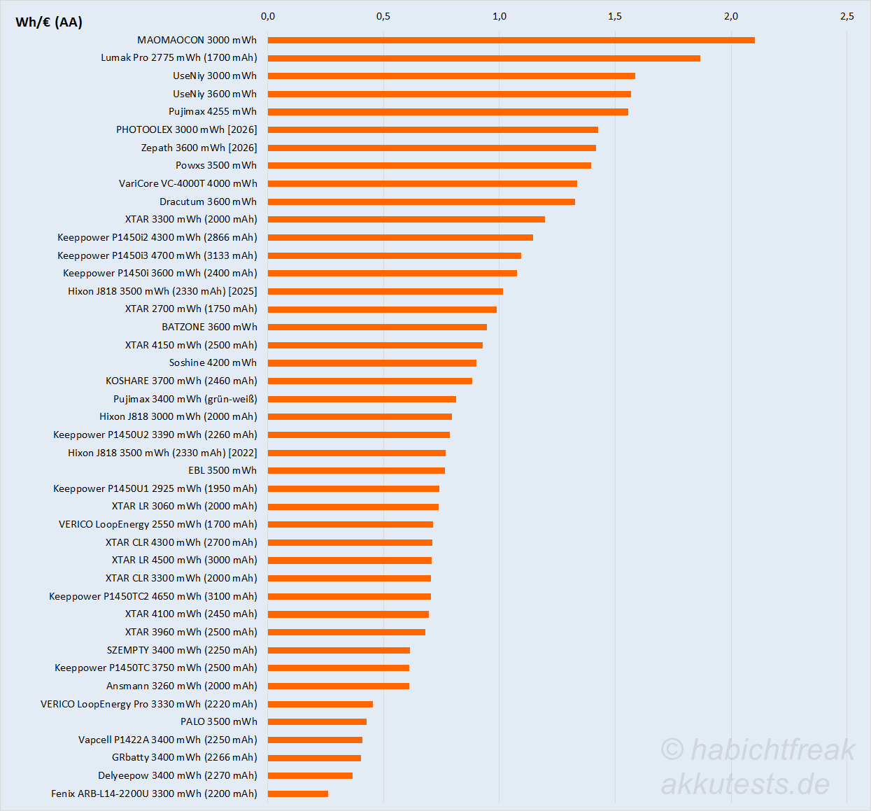 In der Baugröße AA gibt es erfreulich viele Modelle, die sehr nah an die Herstellerangaben herankommen. Ein paar Modelle liegen etwas unterhalb der Herstellerangabe, selten findet man auch mal ein Modell das sogar etwas mehr liefert als angegeben. Und vor der letzten Gruppe, den schwarzen Schafen, kann man nur warnen.