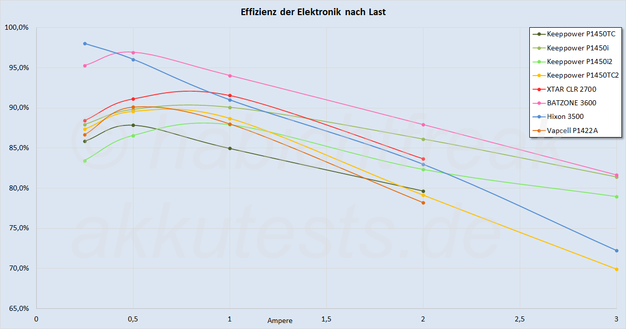 Was sich auch schon im Balkendiagramm erkennen ließ, wird auch hier deutlich. Bei 2 und 3A arbeitet die Elektronik der P1450i2 effizienter als die im P1450TC2. Bei 1A oder geringeren Strömen ist es genau umgekehrt. Neue Maßstäbe setzt hier die Elektronik in den P1450i, die in allen Bereichen am effizientesten arbeitet. Das wirft die Frage auf, warum diese Technik nicht auch im P1450i2 und P1450TC2 steckt. Eine Frage die nur Keeppower beantworten kann.