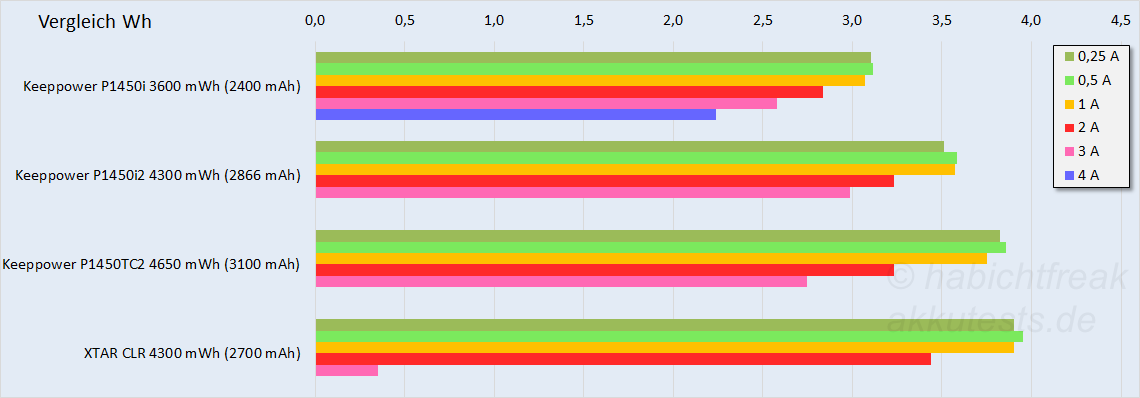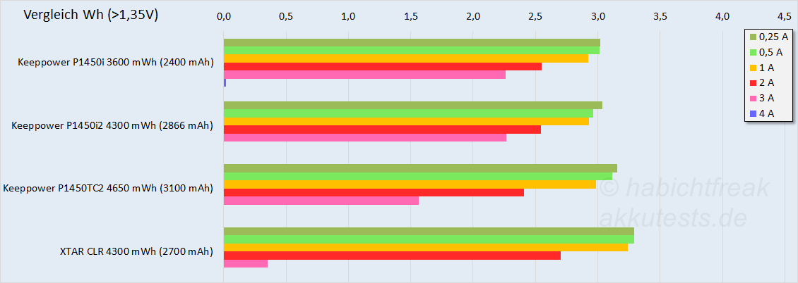 Auf den ersten Blick ergibt sich ein erwartetes Bild. P1450i2 sind besser als P1450i, P1450TC2 sind besser als P1450i2 und liefern sich ein Kopf an Kopf rennen mit den XTAR CLR 2700 mAh. (Die Messungen für 3A nicht berücksichtigt, da keines der Modelle offiziell 3A dauerhaft liefern kann). Schaut man sich allerdings nur die Energie an die die Akkus bis zum Unterschreiben von 1,35V liefern, sieht es etwas anders aus: